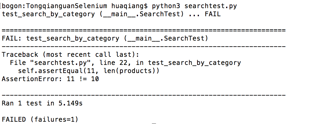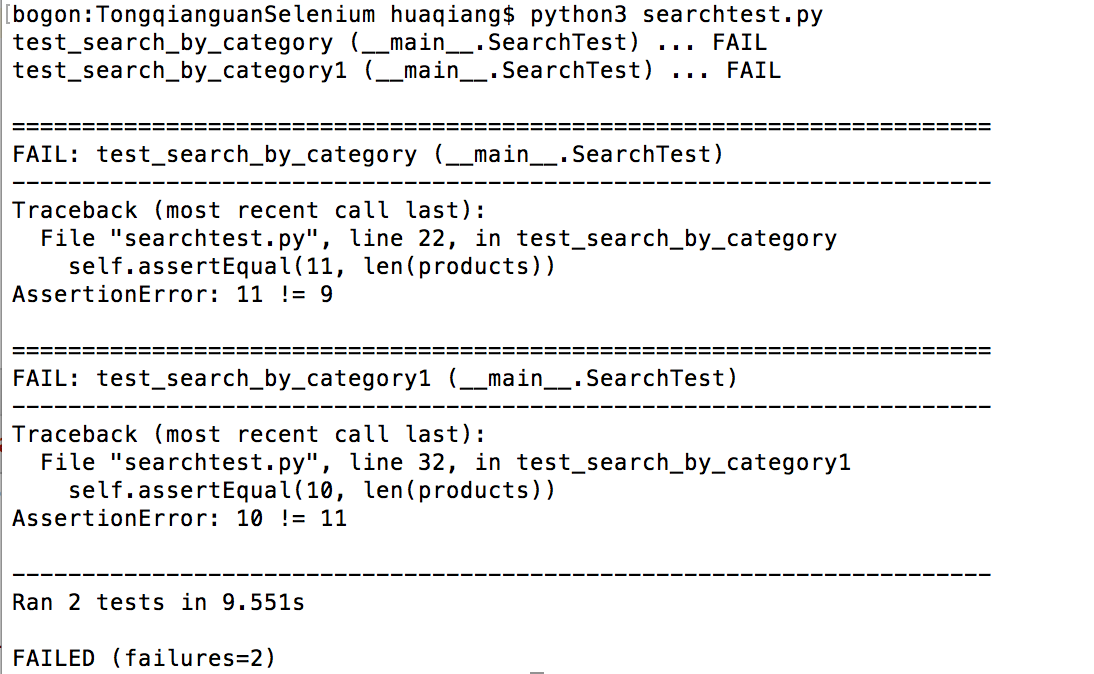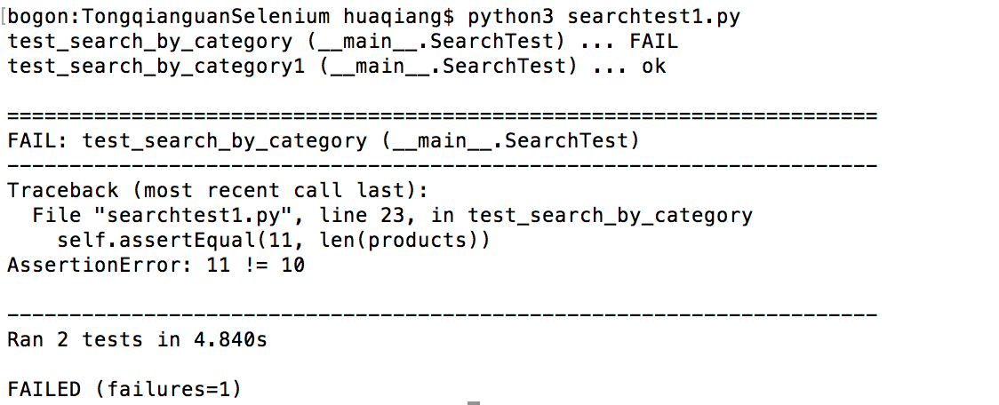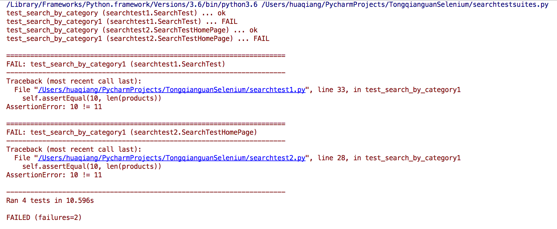 # -*- coding:utf-8 -*- import unittestfrom selenium import webdriver class SearchTest(unittest.TestCase):    @classmethod    def setUpClass(cls):        cls.driver = webdriver.Firefox()        cls.driver.implicitly_wait(15)        cls.driver.maximize_window()         cls.driver.get('http://www.baidu.com')     def test_search_by_category(self):        self.search_field = self.driver.find_element_by_id("kw")        self.search_field.clear()        self.search_field.send_keys('铜钱贯')        self.search_field.submit()         products = self.driver.find_elements_by_xpath("//div[contains(@class, 'c-abstract')]")         self.assertEqual(11, len(products))     def test_search_by_category1(self):        self.search_field = self.driver.find_element_by_id("kw")        self.search_field.clear()        self.search_field.send_keys('铜钱贯')        self.search_field.submit()         products = self.driver.find_elements_by_xpath("//div[contains(@class, 'c-abstract')]")         self.assertEqual(10, len(products))     @classmethod    def tearDownClass(cls):        cls.driver.quit() if __name__ == '__main__':    unittest.main(verbosity=2)