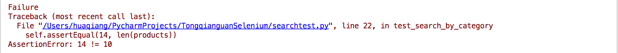 # -*- coding:utf-8 -*- import unittestfrom selenium import webdriver import time  class SearchTest(unittest.TestCase):    @classmethod    def setUpClass(cls):        cls.driver = webdriver.Firefox()        cls.driver.implicitly_wait(15)        cls.driver.maximize_window()         cls.driver.get('http://www.baidu.com')     def test_search_by_category(self):        self.search_field = self.driver.find_element_by_id("kw")        self.submit_field = self.driver.find_element_by_id("su")         self.search_field.clear()        self.search_field.send_keys('铜钱贯')         self.submit_field.submit()         products = self.driver.find_elements_by_xpath("//div[contains(@class, 'c-abstract')]")        for product in products:            print("1" + product.text)        self.assertEqual(10, len(products), 'alert description tqg')     def test_search_by_category1(self):        self.search_field = self.driver.find_element_by_id("kw")        self.submit_field = self.driver.find_element_by_id("su")         self.search_field.clear()        self.search_field.send_keys('路飞')         self.submit_field.click()        time.sleep(2)        products = self.driver.find_elements_by_xpath("//div[contains(@class, 'c-abstract')]")         for product in products:            print("2" + product.text)         self.assertEqual(6, len(products), 'alert description lufei')     @classmethod    def tearDownClass(cls):        cls.driver.quit() if __name__ == '__main__':    unittest.main(verbosity=2)