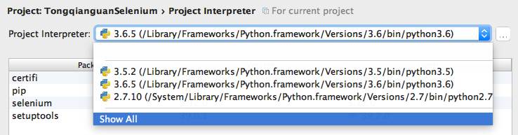在使用PyCharm时,需要配置Python的解释器,我们选择支持selenium的Python版本解释器;