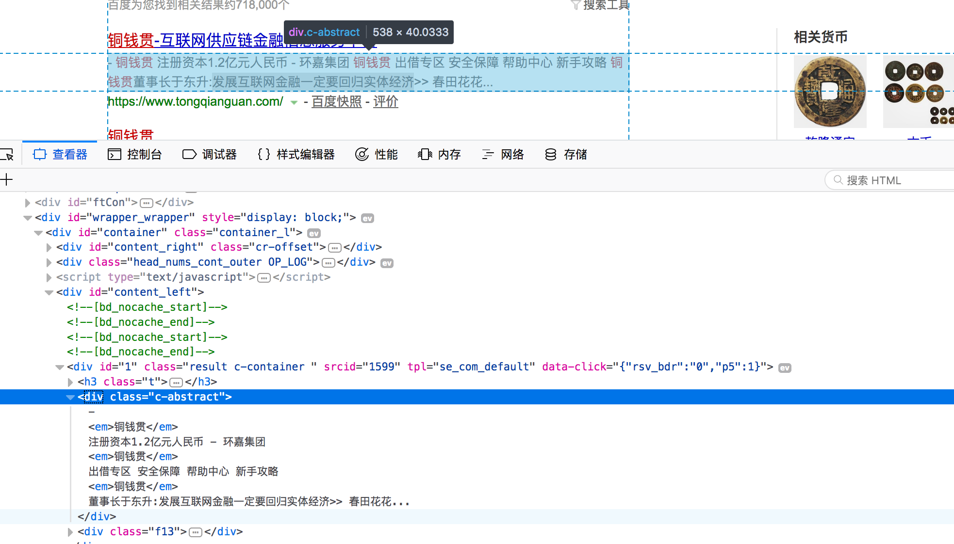 我们尝试使用百度搜索来实践这个脚本:搜索“铜钱贯”,并打印搜索记录的内容: