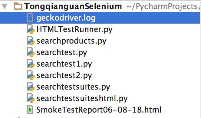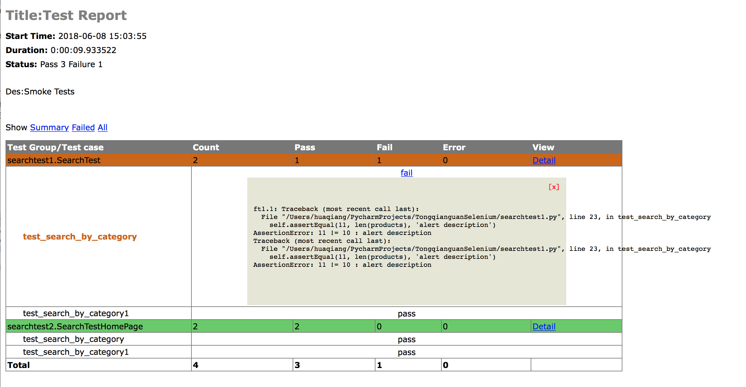 # -*- coding:utf-8 -*- import unittest import HTMLTestRunnerimport os from searchtest1 import SearchTestfrom searchtest2 import SearchTestHomePage from datetime import date now = date.today()datestr = now.strftime('%m-%d-%y') dir = os.getcwd() search_test = unittest.TestLoader().loadTestsFromTestCase(SearchTest)search_test_homepage = unittest.TestLoader().loadTestsFromTestCase(SearchTestHomePage) smoke_tests = unittest.TestSuite([search_test, search_test_homepage]) filepath = dir + "/SmokeTestReport{}.html".format(datestr)with open(filepath, 'wb') as outfile:    runner = HTMLTestRunner.HTMLTestRunner(stream=outfile, title='Title:Test Report', description='Des:Smoke Tests')    runner.run(smoke_tests)