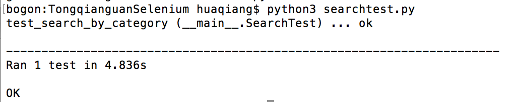 新的测试方法命名同样要以test开头;简单测试我们复制第一个示例中的测试,修改测试方法名;通过终端再次运行:(searchtest.py)