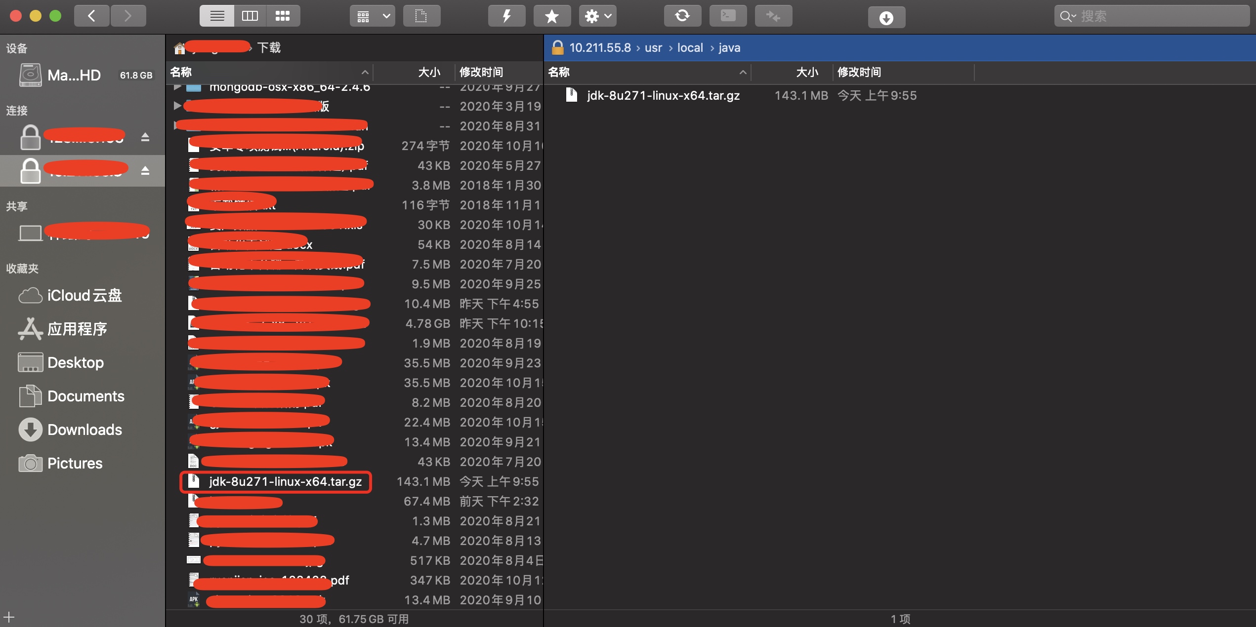 使用FTP上传至/usr/local/(也可以自己mkdir一个文件夹,一般名为java)
