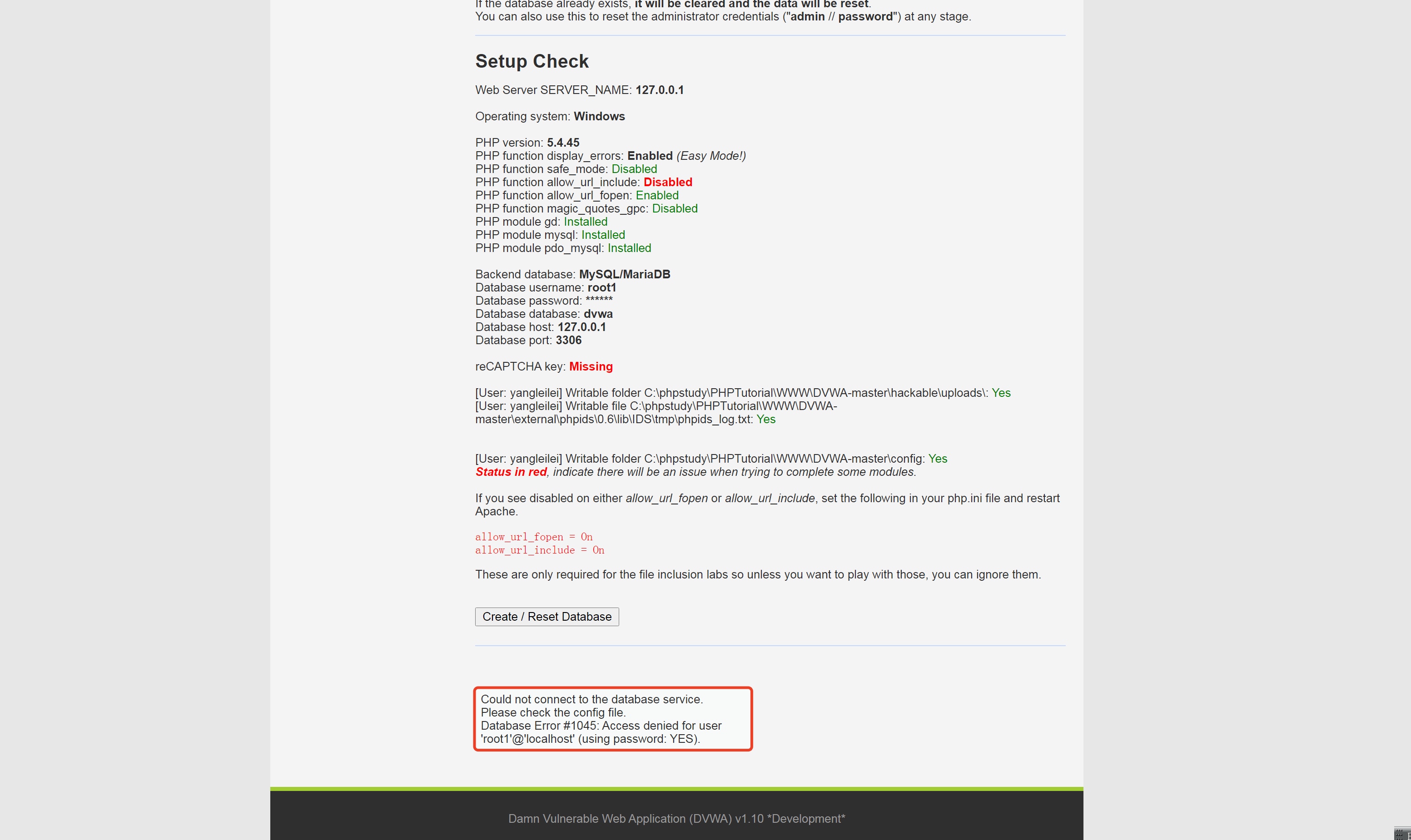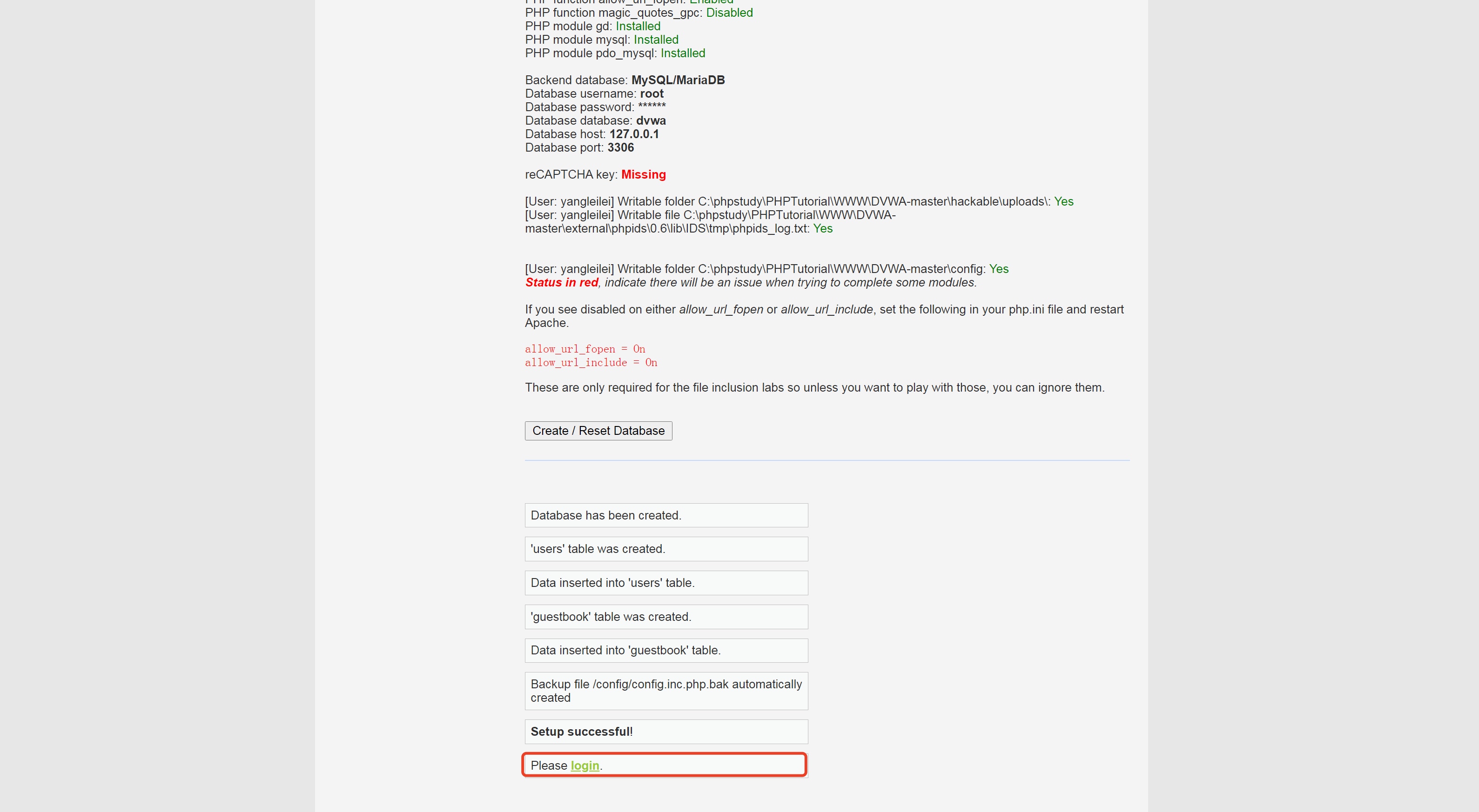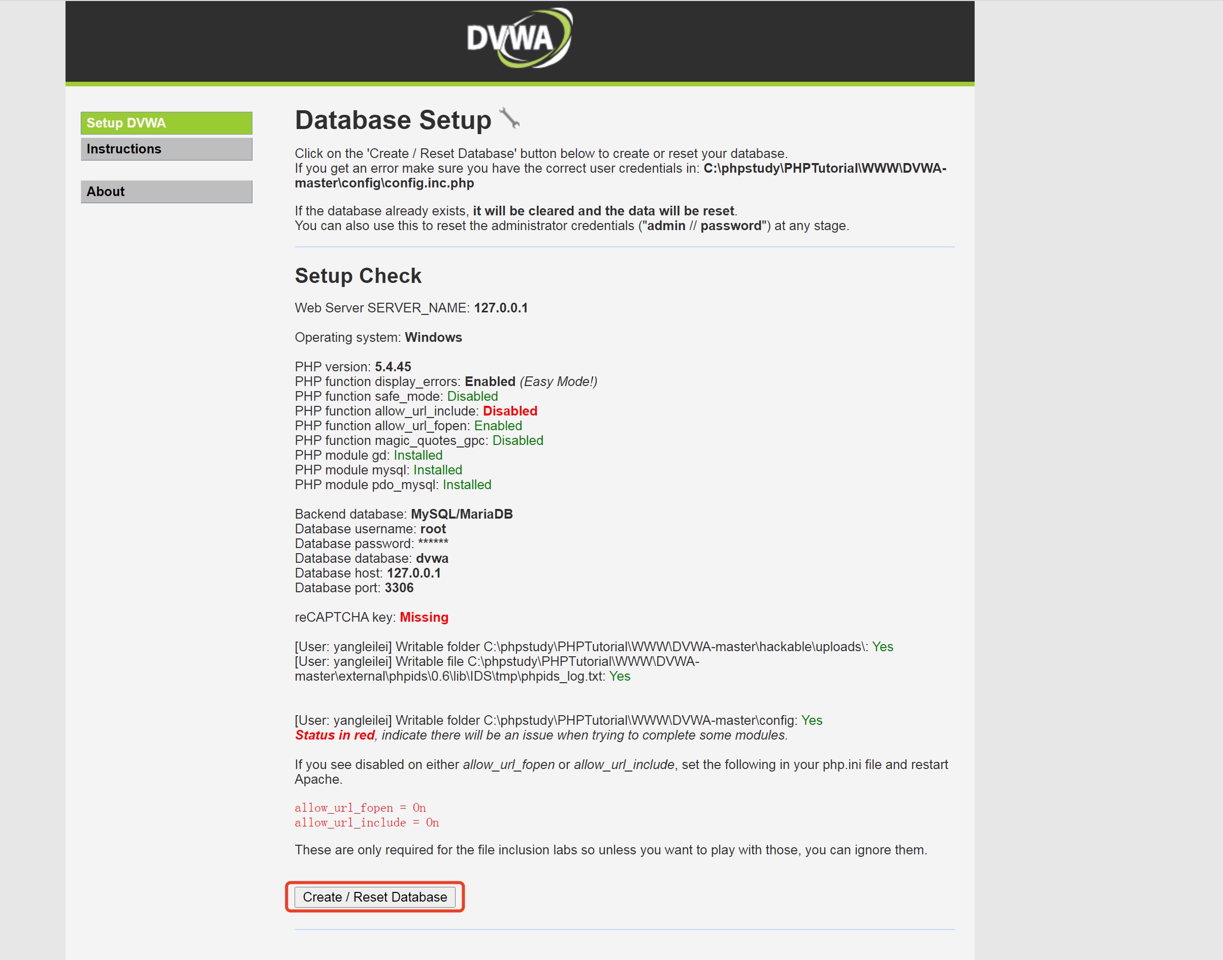 Create/Reset Database后,如下图则表示数据库用户名用户名与密码正确