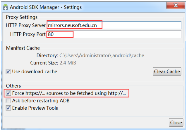 需要注意的是默认Android SDK下载组件是需要外网访问的,我们可以通过设置代理解决:
