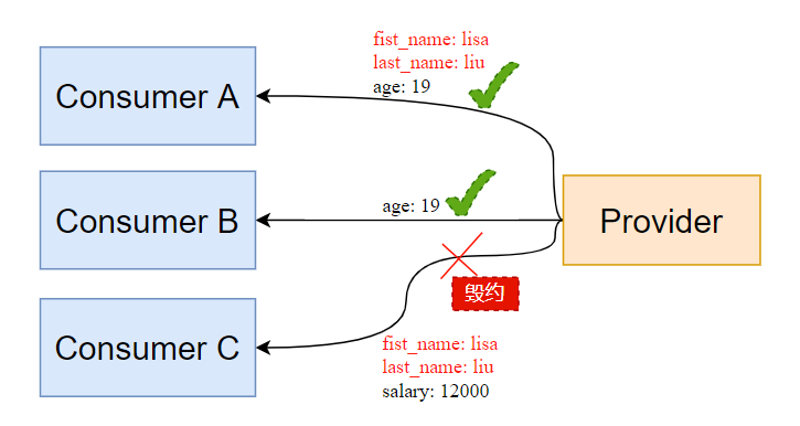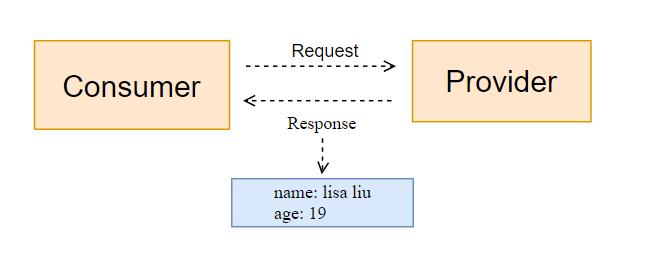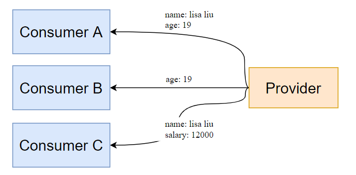 A 和 P 说,你能把你的数据卖给我吗? P 很高兴的答应了,并且和 A 签订合同(契约),每次 A 发起请求,P 就按约定给出姓名和年龄的数据。A 是数据的消费者(Consumer),D 是数据的提供者(Provider)。
