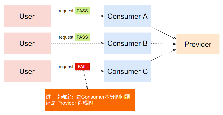 第一点,你可以想象一下,你就是 provider。 当你修改完代码之后,什么时候可以确定自己修改的代码质量没有问题呢? 首先,你得找到有哪些 consumer 依赖了自己的服务,然后,你只能祈祷所有的 consumer 快点完成他们的测试,至于到底什么时候能完成,你只能多走几遍跨部门协作的流程,多催催他们。 实际上,因为每个服务的复杂程度不一样,所以测试的效率会有很大区别。
