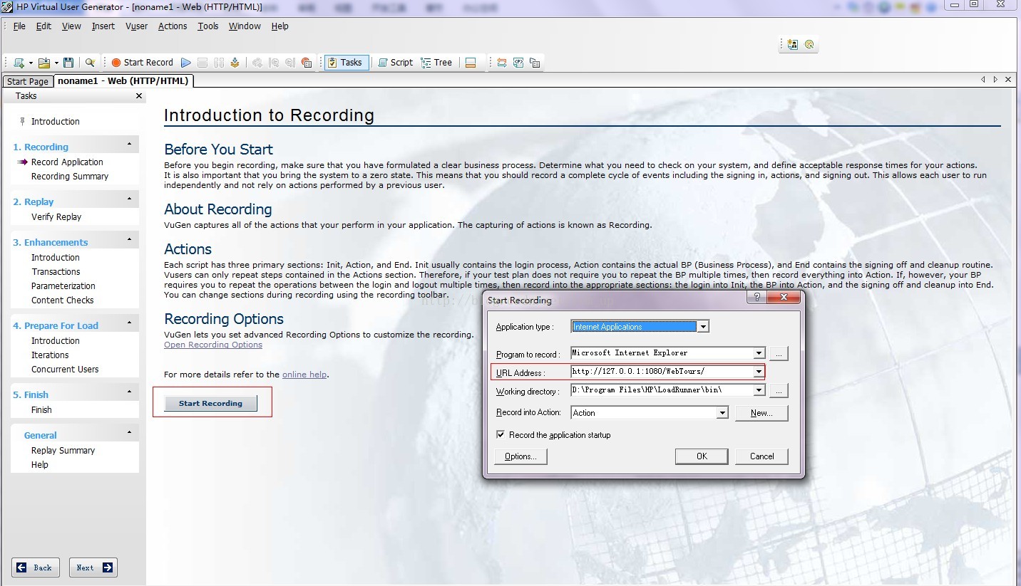 在“URL”地址框中,键入 http://127.0.0.1:1080/WebTours/。在“录制到操作”框中,选择“操作”。单击“确定”。