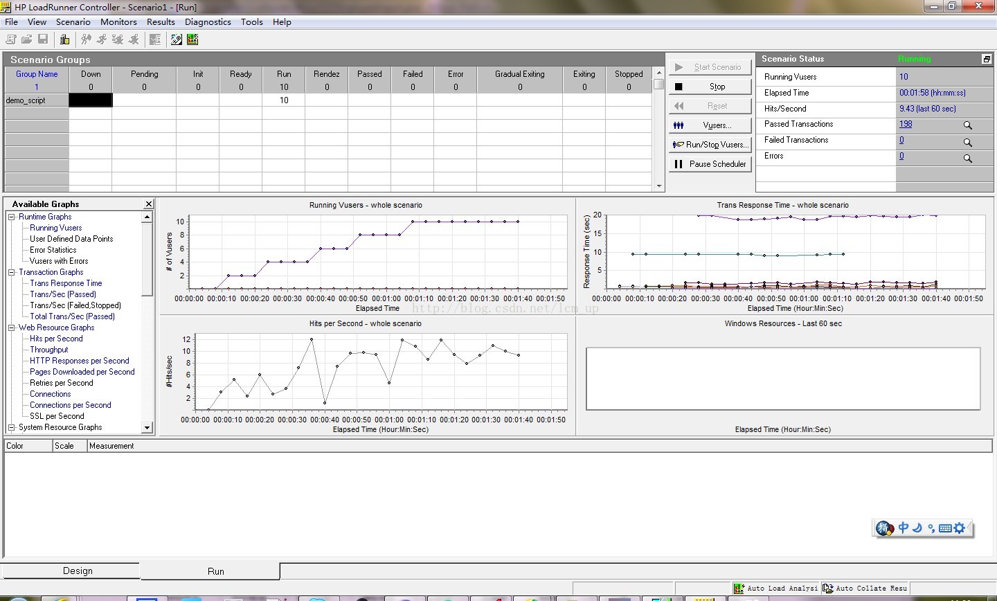单击“启动场景”按钮 。将显示 Controller 运行视图, Controller 将开始运行场景。在“场景组”窗格中,可以看到 Vuser 逐渐开始运行并在系统上生成负载。可以
